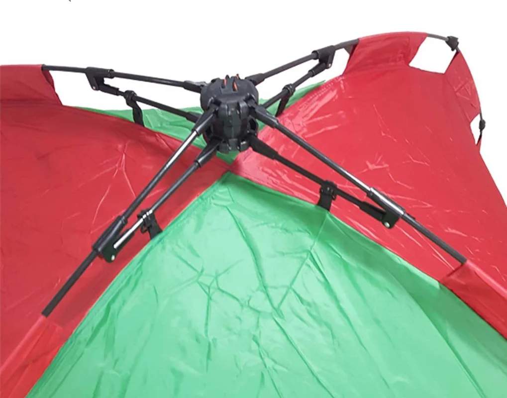 چادر مسافرتی اتوماتیک 4 نفره از چهار طرف بازوهای برای نگهداری از این چادر و شکل دادن به بدنه آن دارد، وقتی این سازه ها شکل خود را گرفت روی قسمت بالایی چادر که یک دایره پلاستیکی بسیار مستحکم دارد با یک فشار کوچک دست کل سازه را توسط فنری که بین خود و چادر دارد روی زمین شکل میدهد و بر روی خود یک کلاهک برای نشان داده نشدن این سازه نیز دارد تمام زمان باز و بسته شدن کمتر از یک دقیقه است، این چادر مسافرتی از پلیستر ضخیم آپارات شده ضد آب ساخته شده است و برای محافظت این چادر در برابر باد میتوان پایه های این محصول را توسط میخ و طناب نگهدارنده روی زمین متصل کرد.ابعاد چادر : 210*210*145 سانتی متر- دارای رویه از جنس پلی آسترابعاد بسته بندی : 16*11*74 سانتی متروزن بسته بندی : 2.73 کیلوگرم